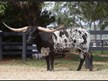 DB CUT'N GIRL is a top-shelf cow. She has Cowboy Tuff Chex, Drag Iron, Shining Victory, and WS Jamskizm. I like this girl. Sweet-natured and just looks at you. She has a beautiful black and white heifer sired by DH Trigger Marshal son of Rowdy HR who has 85" TTT horn at 3.5 years old.